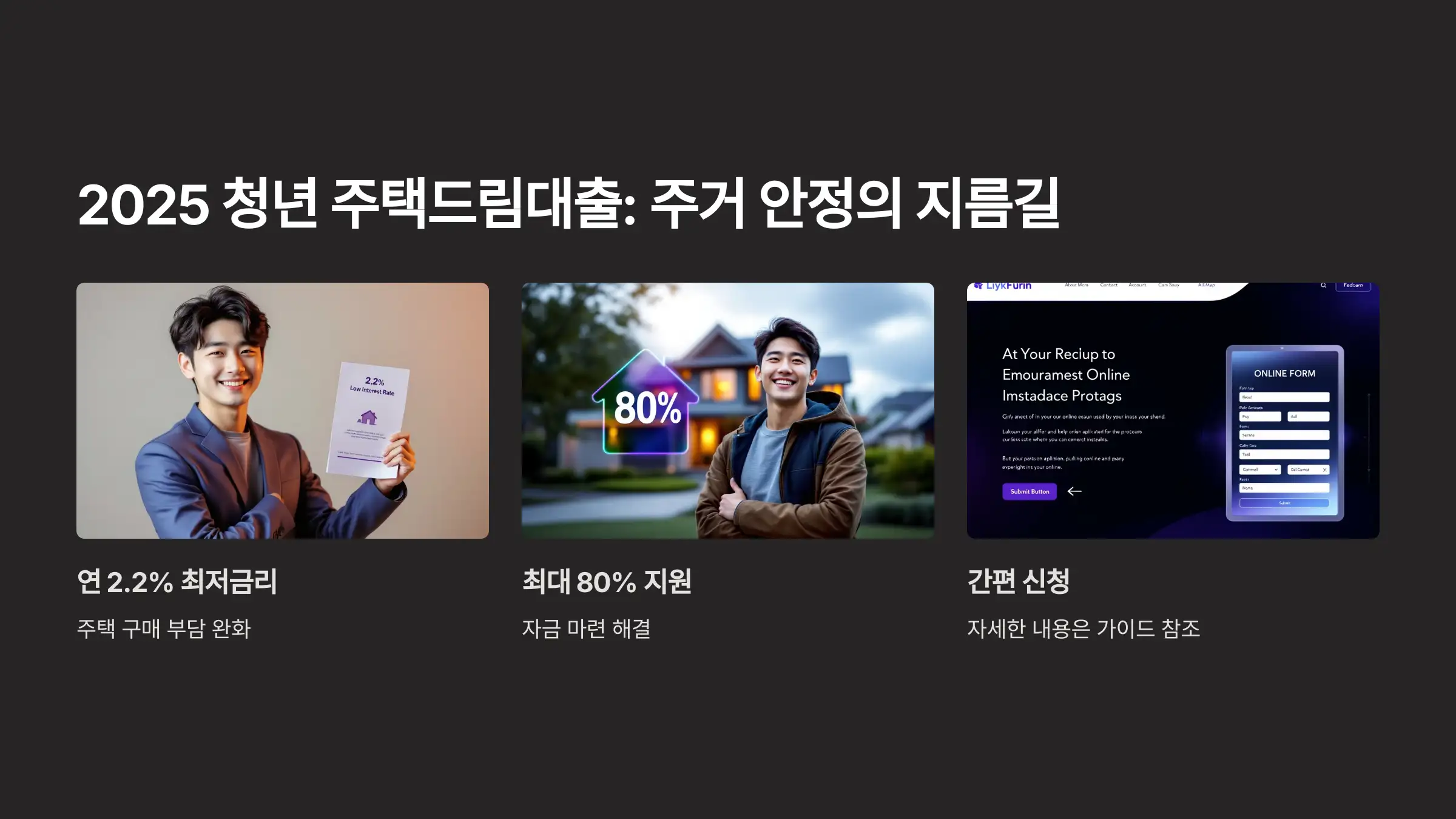 A1. 2025 청년 주택드림대출은 청년들의 주거 안정을 위해 최저 연 2.2% 금리로 주택 분양가의 최대 80%까지 대출을 지원하는 정책 대출 상품입니다. 주로 청년 주택청약 당첨자를 대상으로 합니다.